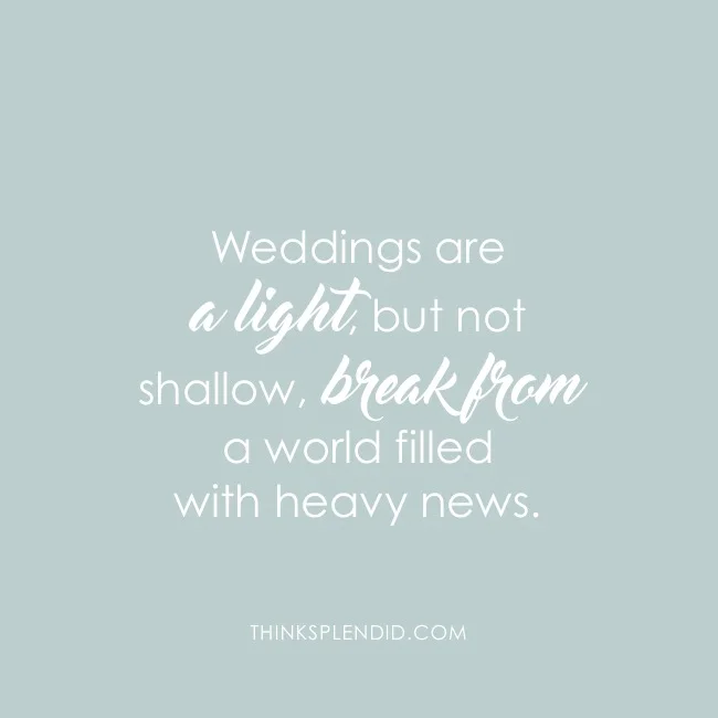 This is not to say that I think weddings are, by default, superficial or materialistic. I’ve also had the great pleasure of working with people who understand what a wedding is really about. I love weddings because they are – at their core – a celebration of people. They celebrate the couple, their love, and their decision to go through life together, thick and thin. They also celebrate every single guest in the room. Weddings are a way of honoring the people who helped shape a bride or groom into the person the other fell in love with. There is nothing shallow about celebrating love, whether it's the love between a couple, the love between a family, or the love between friends.